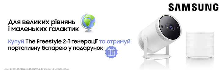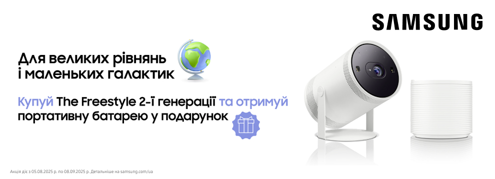 - *Ціни вказані у гривнях. Кількість товару та подарунків обмежена. Ціни та умови пропозиції можуть бути змінені протягом дії акції. Зображення товару на картинці може відрізнятися від фактичного. Під «отримує акумулятор The Freestyle у подарунок*» мається на увазі отримання знижки на проектор у розмірі вартості зовнішнього акумулятора та обов'язкової купівлі зовнішнього акумулятора, щоб у результаті сума двох товарів дорівнювала вартості проектора.