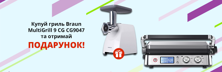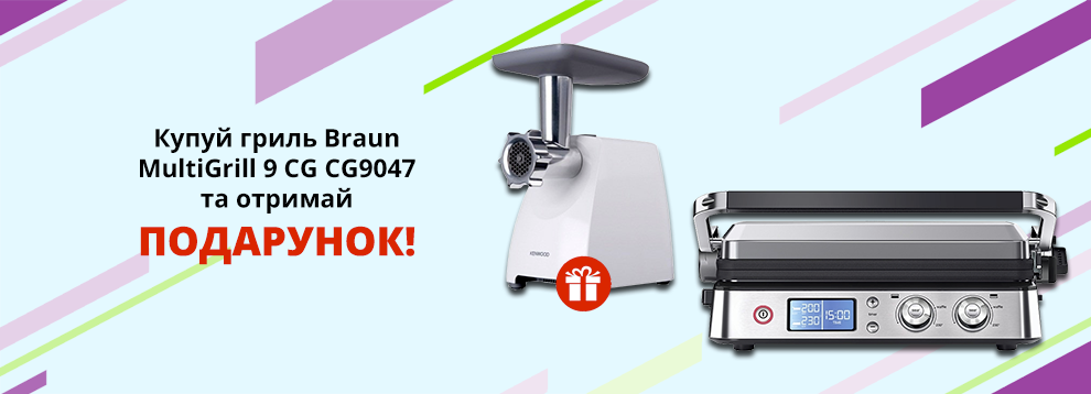- Купуй гриль Braun MultiGrill 9 CG CG9047 та отримай в подарунок м'ясорубку Kenwood MG360! *Ціни вказані в гривнях. Кількість акційного товару обмежена. Діє в кредит. Ціни і умови пропозиції можуть змінюватися протягом дії акції. Під подарунком мається на увазі можливість придбати подарунок (М'ясорубка Kenwood MG360) за 1 грн. Зображення та характеристики товару можуть відрізнятися від картинки.