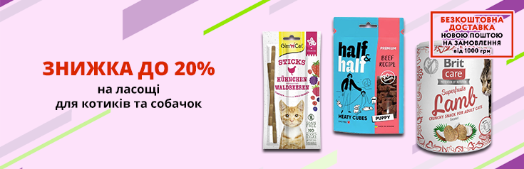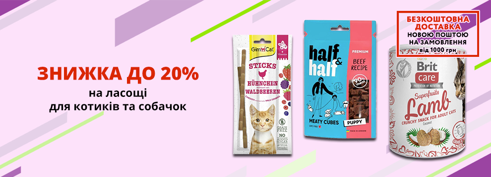 Знижка до 20% на ласощі для котиків та собачок