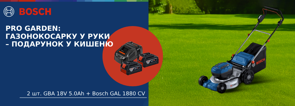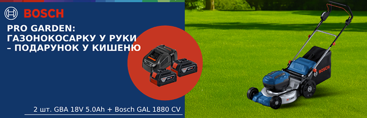 - Купуй Газонокосарку акумуляторну Bosch GRA 18V2-460 18В без АКБ й ЗП (0.600.8C8.000) та отримуй комплект 2шт Bosch GBA 18V 5.0Ah + Bosch GAL 1880 CV у подарунок! *Акція діє при покупці за готівку або кредитною карткою. Ціни вказані у гривнях, кількість товару обмежена. Ціни та умови пропозиції можуть бути змінені протягом дії акції. Зображення товару на фото може відрізнятися від фактичного. Доступно в кредит, розстрочку чи оплату частинами. Під «подарунком» мається на увазі придбання набору 2шт Bosch GBA 18V 5.0Ah + Bosch GAL 1880 CV за ціною 1 грн з ПДВ за 1 шт. Можливість придбання подарунку надається при покупці газонокосарки акумуляторної Bosch GRA 18V2-460 18В без АКБ й ЗУ (0.600.8C8.000). Акція підсумовується з іншими пропозиціями.