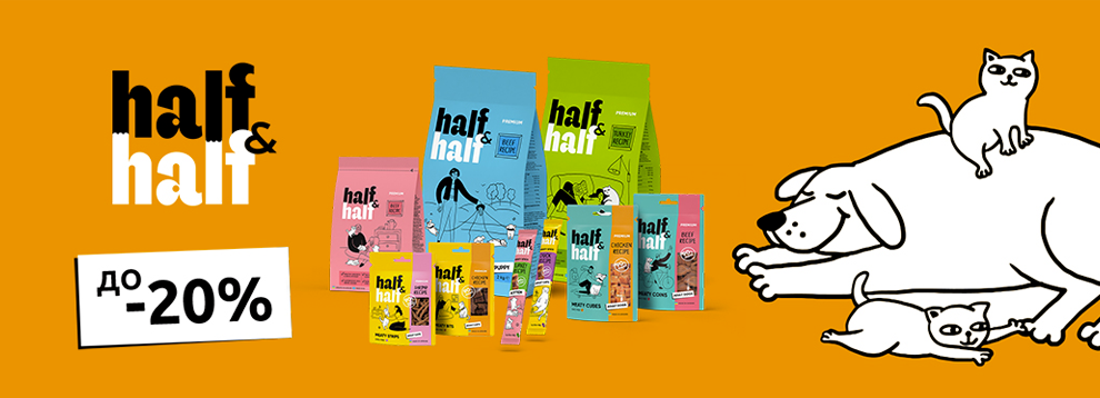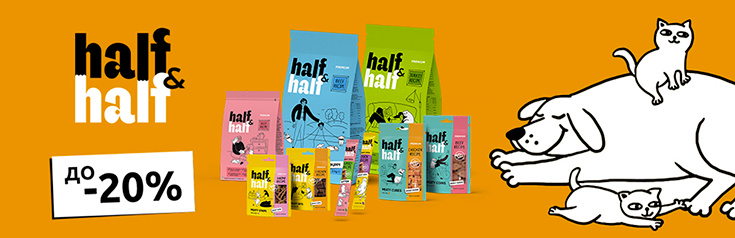 Знижка до 20% на корм та смаколики для собачок та котиків ТМ Half&Half!