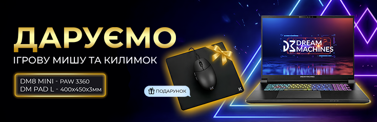Купуй ігрові ноутбуки DREAM MACHINES та отримуй повний стартовий набір геймера у подарунок! Разом із потужним ноутбуком ти отримуєш ігрову мишку DM8 mini та великий килимок DM PAD L. Максимальна точність, комфорт і контроль у кожній грі — усе, що потрібно для перемог, уже в комплекті. Грай на повну з DREAM MACHINES!