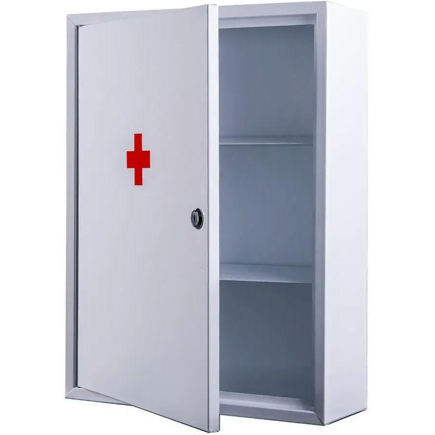 Ящик настінний металевий з двома полицями — ідеально підходить для зберігання медикаментів в офісі. Призначений для використання в офісах, на виробництвах, заводах, фабриках, у стоматологічних і медичних кабінетах. Виготовлений із міцного металу з порошковим фарбуванням, що забезпечує стійкість до корозії та легке очищення. Компактна конструкція дає змогу ефективно використовувати простір, а наявність внутрішньої полиці допомагає впорядкувати зберігання медикаментів і витратних матеріалів. Закривається на замок, що підвищує безпеку збереження вмісту.