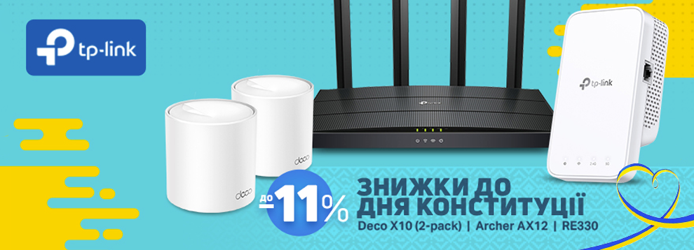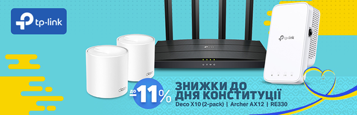 - Купуй нові акційні товари TP-Link та отримай знижку до 15% *Акція діє при покупці за готівку або кредитною карткою. Ціни вказані у гривнях, кількість товару обмежена. Ціни та умови пропозиції можуть бути змінені протягом дії акції. Зображення товару на зображенні може відрізнятися від фактичного. Доступно в кредит, розстрочку чи оплату частинами. Акція підсумовується з іншими пропозиціями.