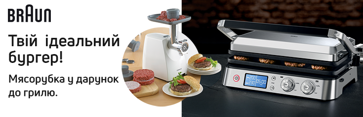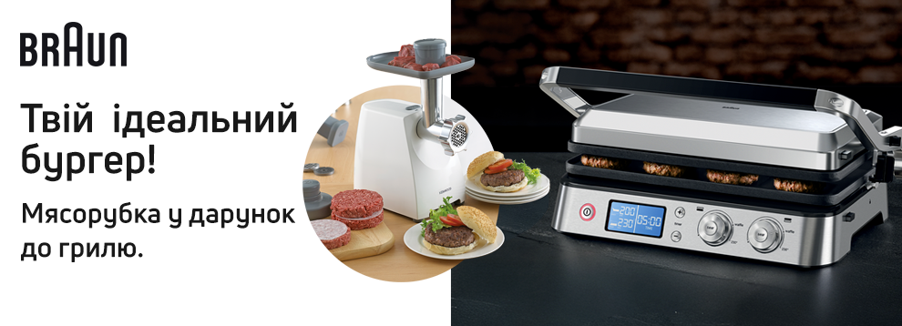 - Купуй гриль Braun, та отримай в подарунок м'ясорубка Kenwood MG360! *Ціни вказані в гривнях. Діє в кредит. Кількість акційного товару обмежена. Під подарунком мається на увазі можливість придбати подарунок (М'ясорубка Kenwood MG360) за 1 грн. Ціни та умови пропозиції можуть змінюватися протягом дії акції. Зображення та характеристики товару може відрізнятися від картинки.