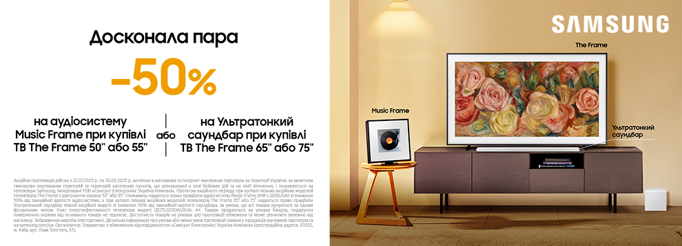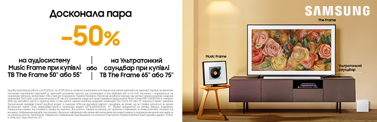 *Ціни вказані у гривнях. Кількість товару за акційними цінами обмежена. Ціни та умови пропозиції можуть бути змінені протягом дії акції. Зображення товару на зображенні може відрізнятись від фактичного. Протягом акційного періоду при купівлі певних акційних моделей телевізорів The Frame з діагоналлю екрана 50” або 55” споживачу надається право придбати аудіосистему Music Frame (HW-LS60D/UA) зі знижкою 50% від звичайної вартості аудіосистеми, а при купівлі певних акційних моделей телевізорів The Frame 65” або 75” надається право придбати Ультратонкий саундбар певної акційної моделі зі знижкою 50% від звичайної вартості саундбара, за умови, що всі товари купуються за одним фіскальним чеком. Товари продаються на умовах бандла, подарунок поверненню окремо від основного товару не підлягає. Доступність товарів на умовах цієї пропозиції обмежена та може різнитися залежно від магазину.