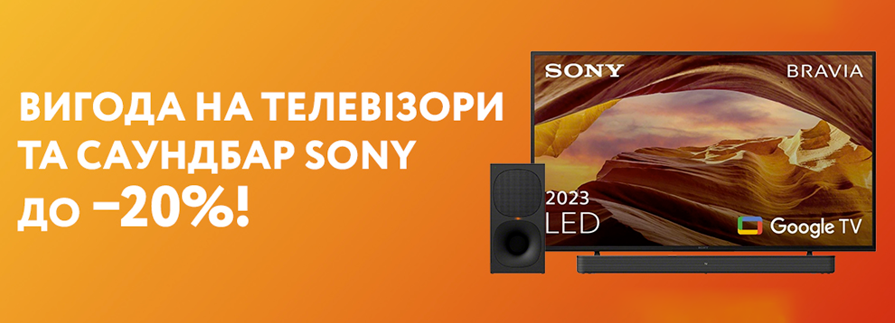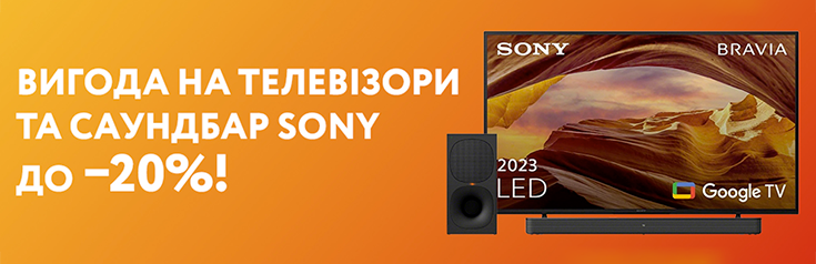 - На телевізори та саундбар Sony діють спеціальні ціни зі знижкою до 20%. *Ціни вказані у гривнях. Кількість товару за акційними цінами обмежена. Ціни та умови пропозиції можуть бути змінені протягом дії акції. Зображення товару на зображенні може відрізнятись від фактичного.