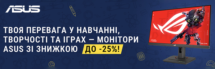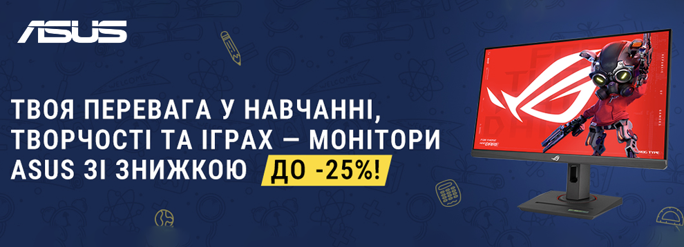 - Твоя перевага у навчанні, творчості та іграх - монітори ASUS зі знижкою до -25% *Акція діє при покупці готівкою або кредитною карткою. Ціни вказані у гривнях, кількість товару обмежена. Ціни та умови пропозиції можуть бути змінені протягом дії акції. Зображення товару на фото може відрізнятися від фактичного. Доступно в кредит, розстрочку чи оплату частинами. Акційна пропозиція дійсна на території України за винятком тимчасово окупованих територій та територій населених пунктів, що розташовані в зоні бойових дій та на лінії зіткнення.