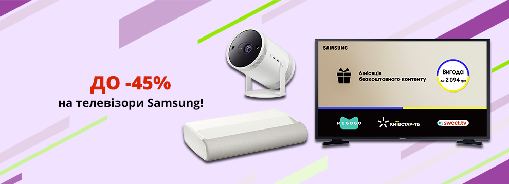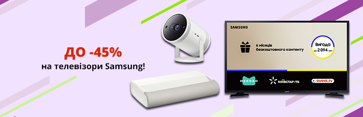 - На Samsung діють спеціальні ціни зі знижкою до 45%. *Ціни вказані у гривнях. Кількість товару за акційними цінами обмежена. Ціни та умови пропозиції можуть бути змінені протягом дії акції. Зображення товару на картинці (фото) може відрізнятись від фактичного.