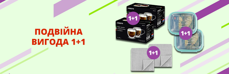 - Акція діє до моменту, поки подарунки є в наявності. Грошовий еквівалент або заміна подарунків у разі їх відсутності не застосовується. 1 покупка товару = 1 подарунок. *Під "Купуй 1, отримай ще 1 у подарунок! 1+1=1*!" мається на увазі можливість придбати акційний товар, і отримати можливість придбати другій аналогічний товар за ціною 1 грн. з урахуванням ПДВ. Акція діє при покупці за готівку або кредитною карткою Ціни вказані у гривнях, кількість товару обмежена. Ціни та умови пропозиції можуть бути змінені протягом дії акції. Зображення товару на фото може відрізнятися від фактичного. Не доступно в кредит, розстрочку чи оплату частинами.