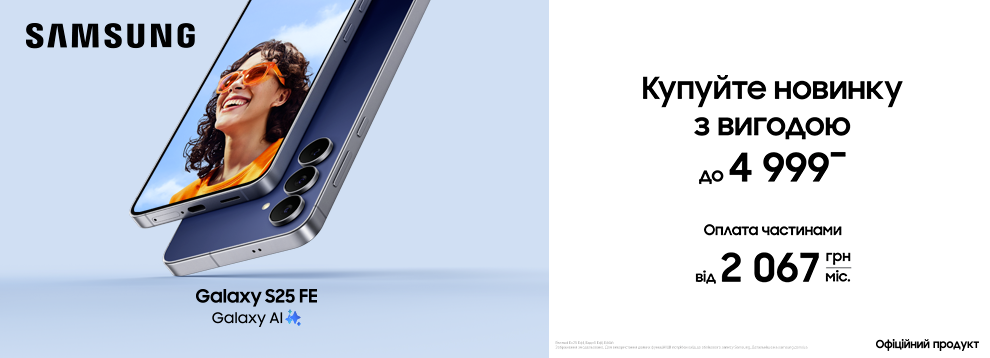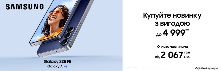 - Купуйте смартфон Samsung Galaxy S25FE та отримуй навушники Galaxy Buds FE 3 у подарунок *Пропозиція діє на товар забраний безпосередньо до закінчення терміну дії акції. Акція діє при купівлі за готівку або кредитною карткою. Ціни вказані у гривнях, кількість товару обмежена.Під подарунком мається на увазі можливість придбати Навушники Samsung Galaxy Burds FE3 за 1 грн. Ціни та умови пропозиції можуть бути змінені протягом дії акції. Зображення товару на фото може відрізнятися від фактичного. Доступно в кредит, розстрочку чи оплату частинами. Акція не підсумовується з іншими пропозиціями.