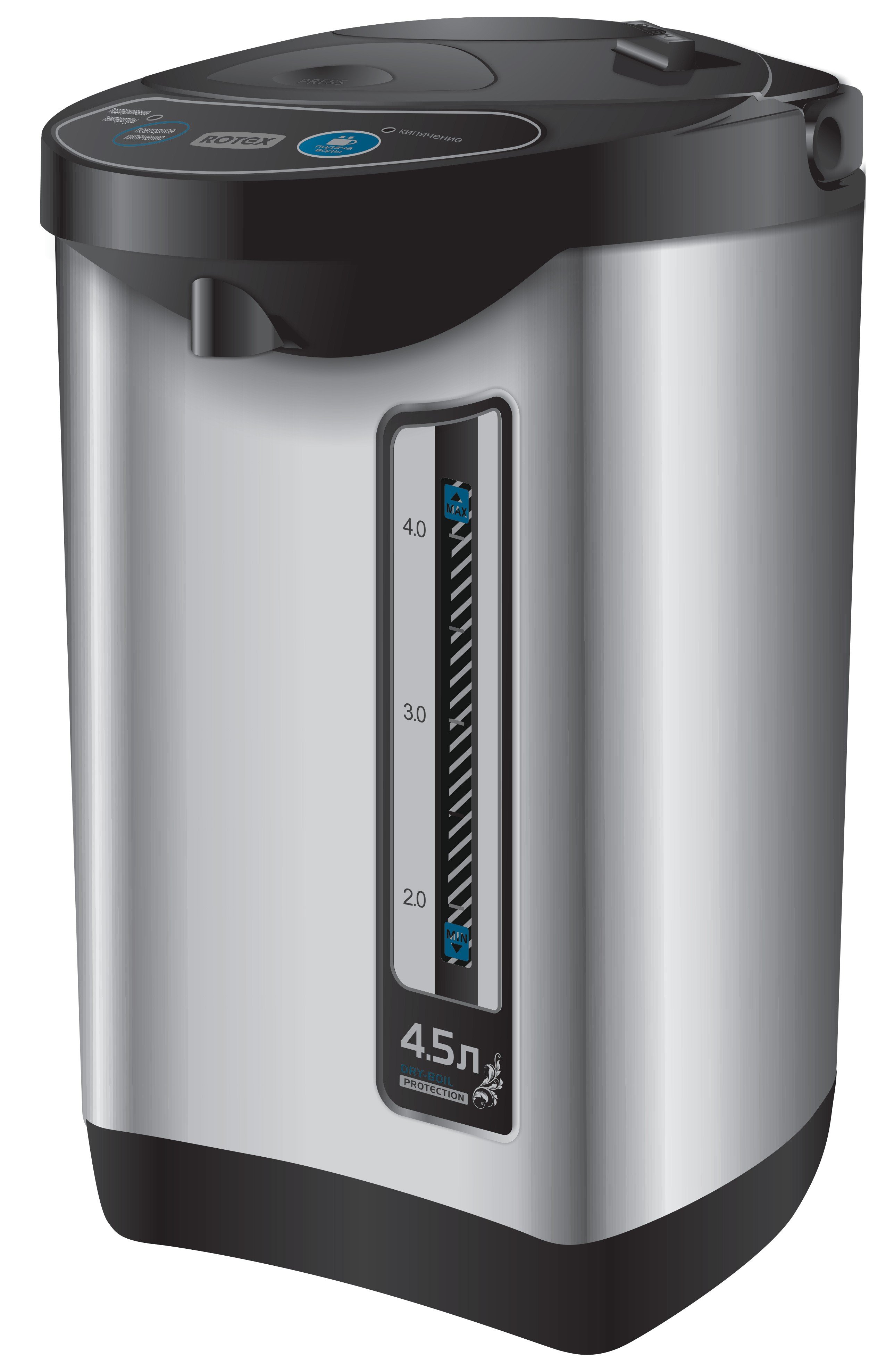 Электрочайник Rotex RTP450-U – современный термопот с привлекательным дизайном, который выполнен в строгом и одновременно элегантном стиле. В основе данной модели используется нержавеющая сталь, с которой изготовлен нагревательный элемент и корпус термпота.  Благодаря этому, этот прибор прослужит многие годы. Мощность данной модели составляет 800 Вт. Питание — 220-240 В, 50 Гц. Объем этого термопота — 4.5 л. Оснащен защитой от перегрева и протекания. Для максимального комфорта использования, данную модель оснастили удобной ручкой для переноса.