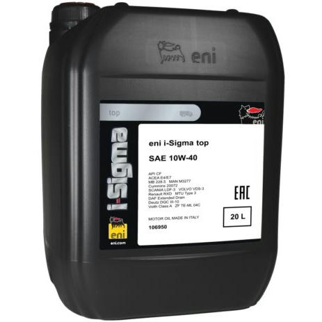 Eni i-Sigma top 10W-40 всесезонное высокоэффективное моторное масло на основе синтетических технологий. Подходит для смазки дизельных двигателей, работающих в тяжелых условиях, с топливосберегающими свойствами и позволяет использовать максимальные интервалы между заменами и обеспечивает максимальные интервалы между заменами.