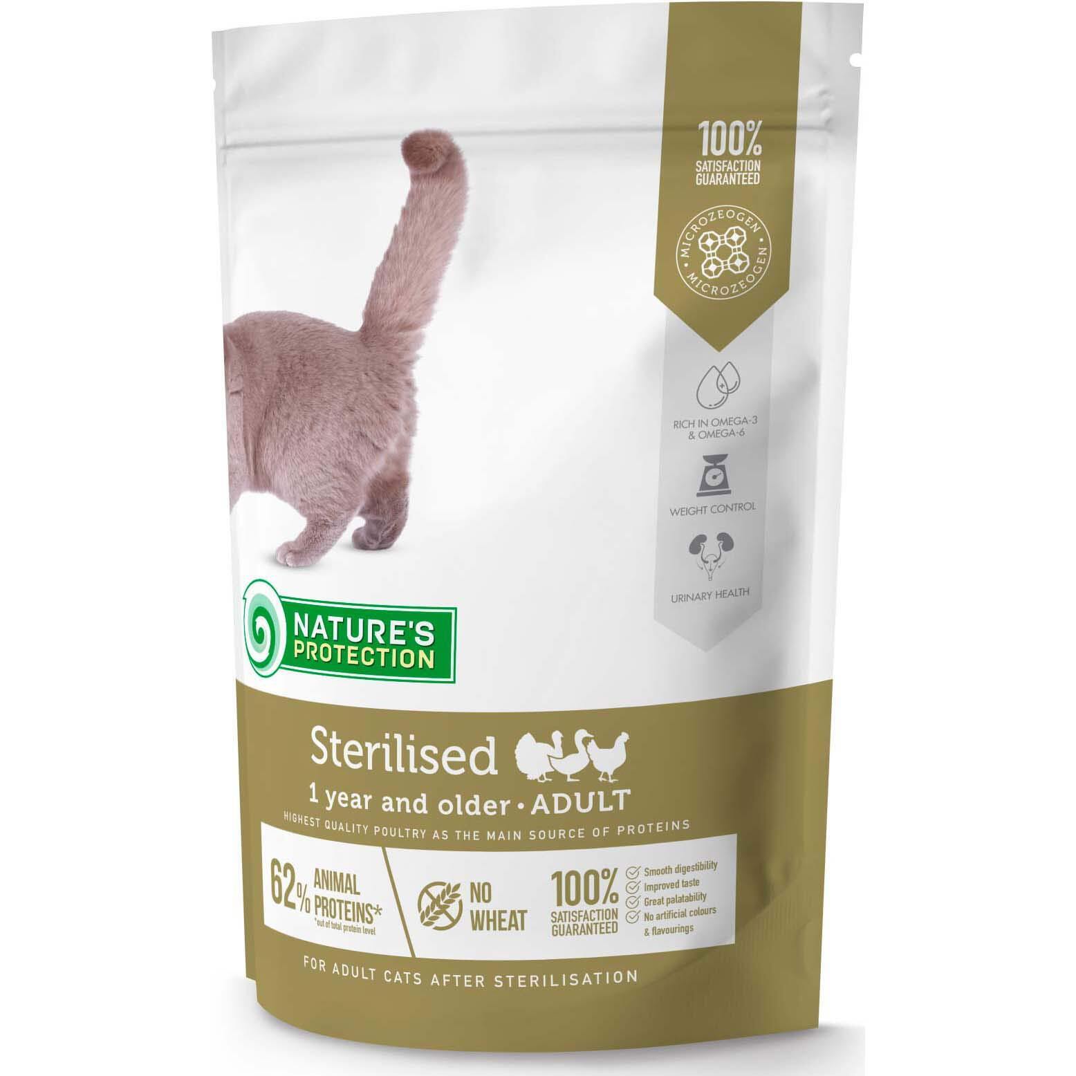 Nature's Protection Sterilised Adult - полнорационный сухой корм для взрослых стерилизованных кошек и кастрированных котов. Оптимально сбалансированная формула корма с пониженным количеством жиров и L-карнитином помогает урегулировать вес и препятствует дальнейшему накоплению избыточной массы тела Вашего питомца. Корм содержит питательные вещества, необходимые для здоровья кожи и шерсти кошки, а также специализированные натуральные микроэлементы для поддержания прочности мышц и оптимальной кислотности мочи домашнего животного.