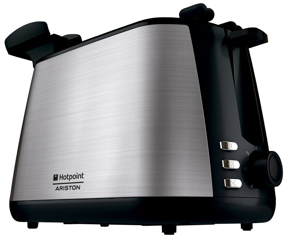 Корпус прибора выполнен из нержавеющей стали, дополненным черными пластиковыми вставками. Обладая мощностью 850 Вт, тостер Hotpoint-Ariston TT22MDXB0 быстро справляется с созданием хрустящей корочки сразу на двух ломтиках хлеба, так как в нем есть два отделения.