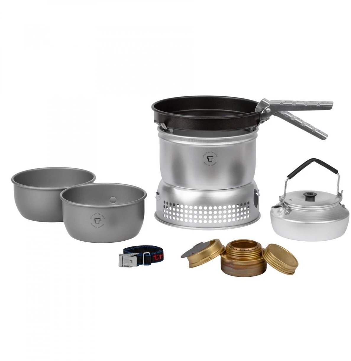 Trangia Stove 27-0 UL/HA — удобный и долговечный комплект для полевой кухни, произведенный в Швеции. Включает спиртовую горелку, двухкомпонентную ветрозащитную подставку, два котелка по 1 л каждый, сковороду и чайник 0.6 л. Относится к серии плит малого диаметра Trangia Stove 27 Small. Подойдет для 1–2 человек. Котелки выполнены из алюминия с твердым анодированием, сковорода имеет антипригарное покрытие. Набор весит 860 г. Все части помещаются внутрь самой большой посудины и фиксируются ремешком.