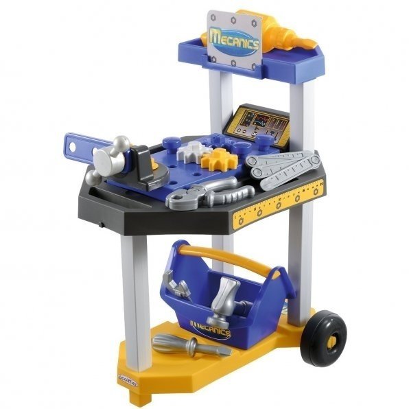 Большая игрушечная тележка, на которой есть рабочая поверхность, оснащенная верстаком. Множество приспособлений для хранения рабочих инструментов и в дополнении большой переносной ящик для инвентаря. Всего набор включает 26 аксессуаров из которых есть отвертка, молоток, плоскогубцы, болтики и многое другое. Набор полностью механический. Познакомит малыша с основными навыками работы рабочих инструментов.