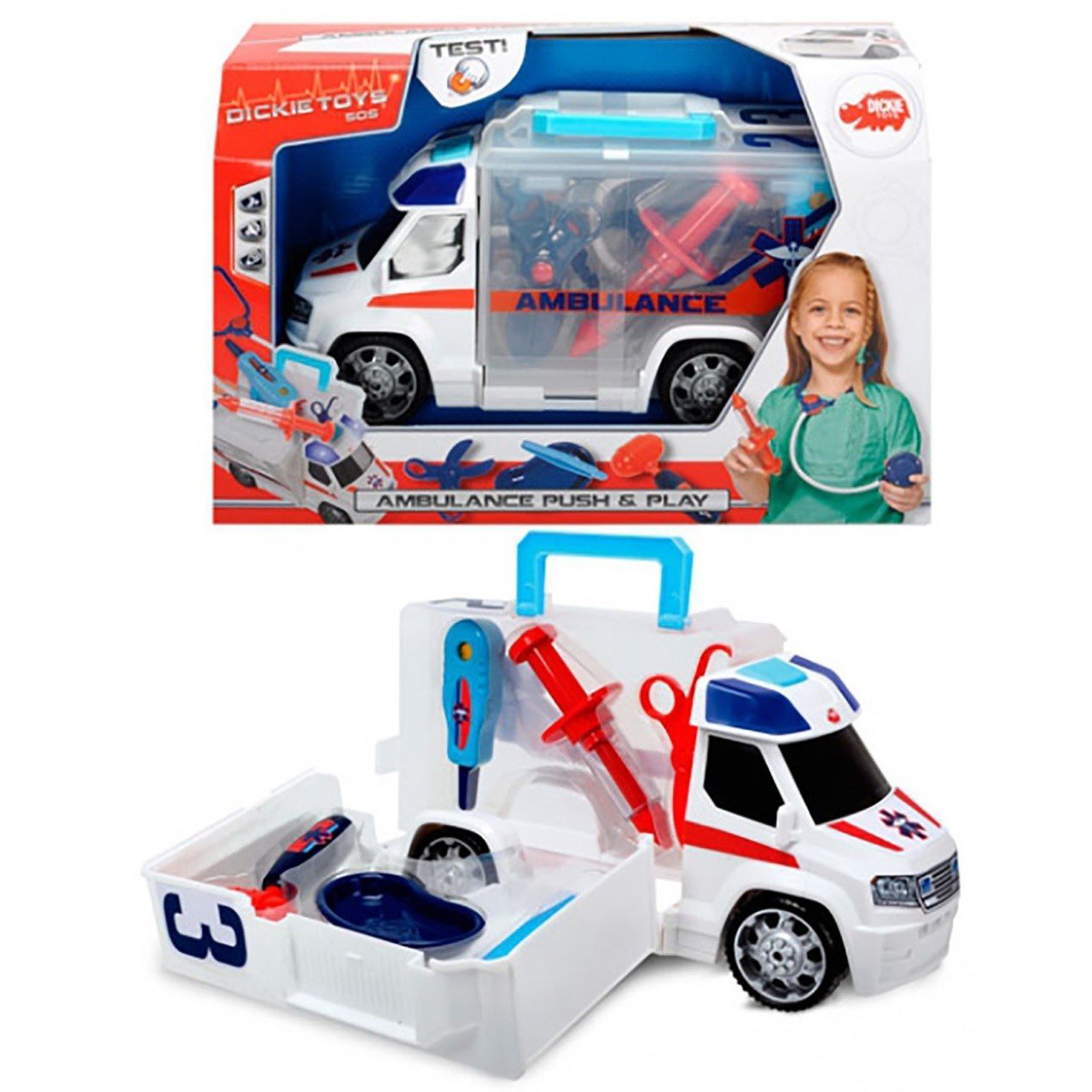 Автомобиль Dickie Toys Скорая помощь с набором доктора звуковым и световым эффектами — игрушка, предназначенная для детей от трех лет. Автомобиль оснащен ручкой для переноски, набором врача в середине (ножницы, шприц, термометр, стетоскоп, щипцы). Продукция компании Dickie варьируется от полицейских машин, кранов, тракторов и самолетов до моделей техники с дистанционным управлением. Dickie – это все, что необходимо мальчикам и девочкам. Игрушки Dickie выполняют множество занимательных функций. Завораживающие световые и звуковые эффекты привносят в игру непередаваемый реализм. В процессе игры ребенок сможет развить множество полезных навыков: мелкую моторику, логику, воображение и внимание.