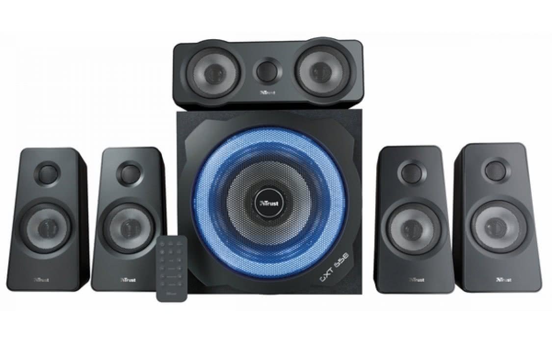 Trust GXT 658 Tytan 5.1 Surround — это комплект динамиков 5.1, в который входит деревянный сабвуфер с общей среднеквадратичной выходной мощностью 90 Вт (пиковая мощность – 180 Вт).