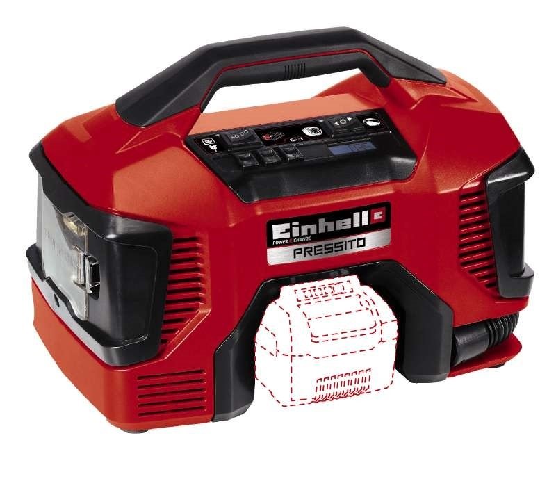 Новый гибридный компрессор Einhell Pressito можно использовать от розетки 220 В или Li-Ion 18-вольтовой аккумуляторной батареи Power X-Change. В компрессоре имеется насос высокого давления для шин автомобилей, мотоциклов и велосипедов, а также насос низкого давления с функцией всасывания низкого давления для надувных матрасов и резиновых лодок (6 в 1-функций). В поставку включен комплект адаптеров 3 предмета. Насос оснащен цифровым индикатором давления с регулируемыми настройками давления до 11 бар и функцией автоматического отключения при достижении заданного давления. Компактный и легкий компрессор можно легко убрать, а благодаря аккумуляторной батарее также можно легко взять с собой туда, где он нужен. Инструмент поставляется без аккумулятора и зарядного устройства, но он может быть приведен в действие с помощью Power X-Change аккумулятора.