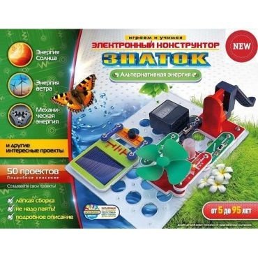 Детали конструктора соединяются без использования процесса паяния. В представленный научный набор входит специальное пособие, при помощи которого ребенок реализует до 50 проектов. Все проекты делятся на три больших блока: энергия ветра, энергия солнца, а также механическая энергия.