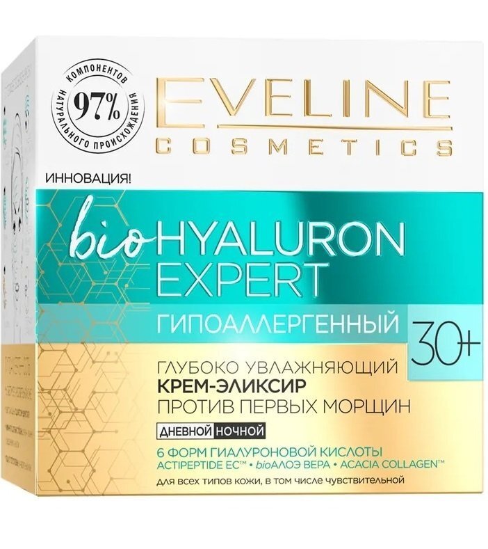 Ультраувлажняющий дневной и ночной крем-эликсир против первых морщин Eveline Cosmetics BioHyaluron Expert 30+ защищает от видимых признаков старения. ACTIPEPTIDE EC эффективно улучшает эластичность кожи, Acacia Collagen глубоко восстанавливает и укрепляет его, кокосовая вода - источник интенсивного увлажнения - прекрасно разглаживает и восстанавливает сияние кожи, BioAloes мгновенно снимает симптомы раздражения, уменьшает сухость и восстанавливает мягкость кожи. Крем-эликсир против первых морщин Eveline Cosmetics BioHyaluron Expert 30+ дарит защиту кожи микробиомом, улучшает упругости кожи, уменьшает мимические морщины, придает коже сияние и здоровый вид.