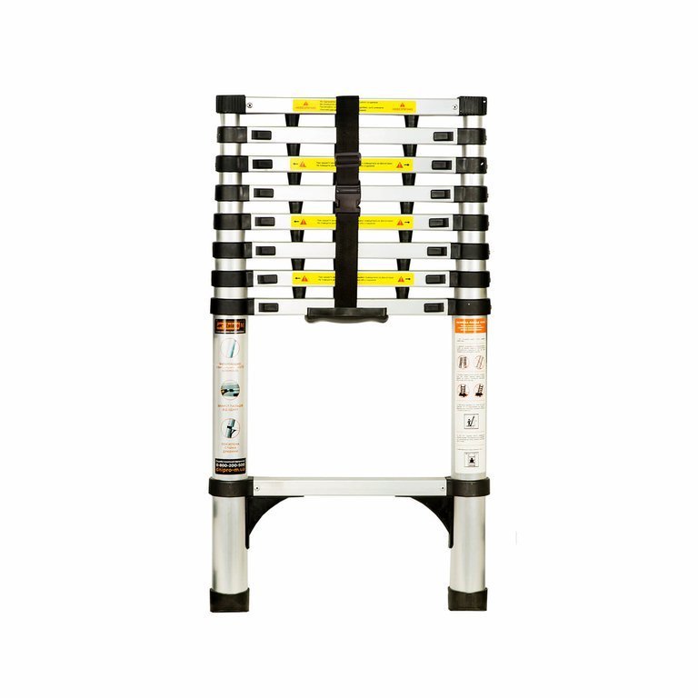 Лестница ДТ-126 длиной 2,6 м применяется при строительных и ремонтных работах, работе в саду, для бытовых нужд. Телескопический принцип строения позволяет регулировать рабочую длину инструмента при работе на различных высотах и упрощает хранение самого инструмента - в сложенном состоянии лестница занимает всего 84,5 см. Лестница изготовлена из высококачественного алюминия. Поэтому инструмент гарантированно выдерживает нагрузку до 150 кг. Рифленые накладки снизу и сверху стоек обеспечивают максимальное сцепление с опорными плоскостями.