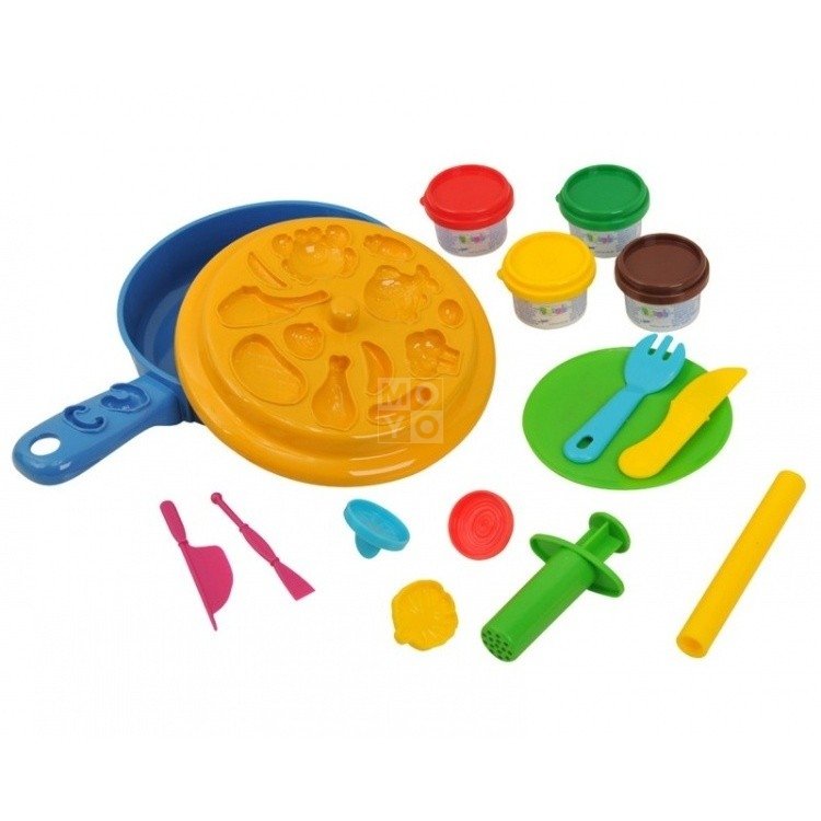 - Комплектация 1 палитра форм, 2 стека для моделирования, 3 пресс-формочки, 4 баночки массы для лепки по 28 г (красный, вилка, желтый, зеленый, коричневый), нож, скалка, сковорода, тарелка, шприц для выдавливания