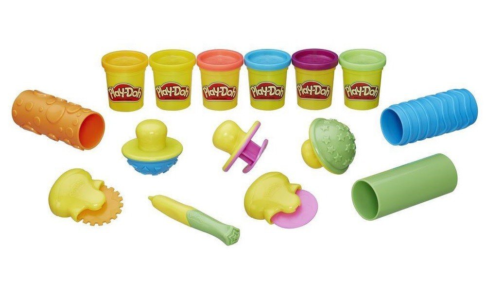 - Комплектация 3 текстурных штампика, 3 ролика, 2 режущих ролика, стилус, 3 двусторонних развивающих коврика, 6 баночек пластилина Play-Doh, инструкция
