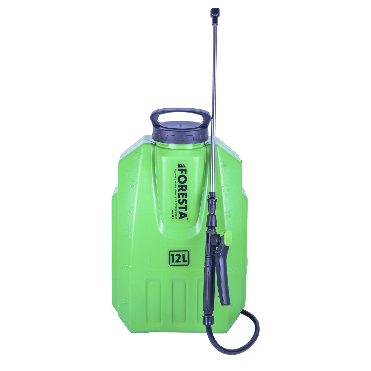 Двигателя инструмента работает под напряжением 12 В, в то время как рабочее давление меняет значение от 0,45 до 0,55 МРа. Вместительный резервуар объемом 12 л позволяет данному садовому инвентарю обработать до 1100 м2, если средний расход жидкости будет 3,1 л/мин. Максимально допустимое давление составляет 4,5 Бар, но это значение можно менять для оптимизации расхода жидкости. В зависимости от вида работ в комплект к распылителю входят 4 насадки. Штанга из нержавеющей стали может изменять свою длину от 700 до 1050 мм, что позволяет обрабатывать разные виды растительности.