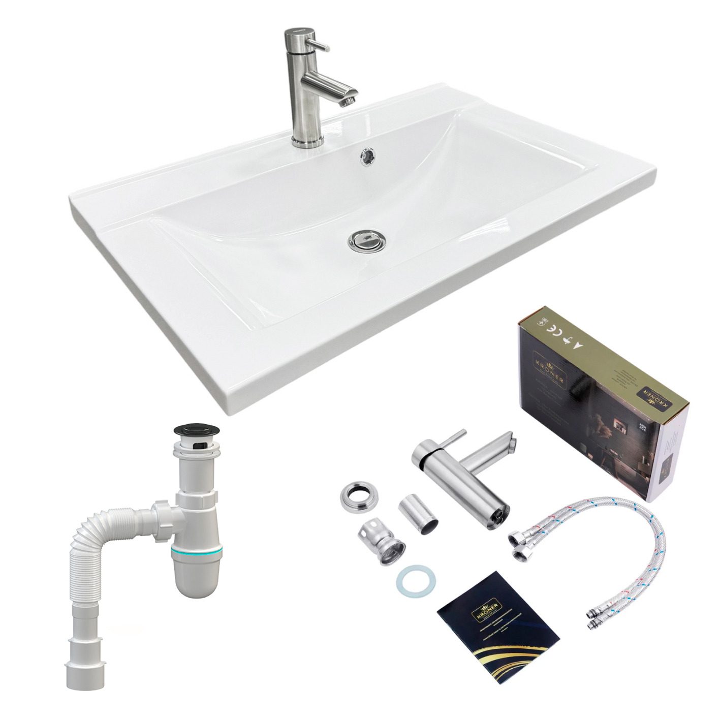 Раковина Adamant QUANTO 70 из искусственного камня предлагает накладной тип установки, прямоугольную форму и отверстие для перелива. Смеситель Kroner KRP Edelstahl Klassisch ESG010 имеет хромовое покрытие, стационарный излив длиной 12 см и монтаж на одно отверстие. Сифон Soloplast Тюльпан 0515 включает мокрый гидрозатвор и автоматический механизм Click-Clack.