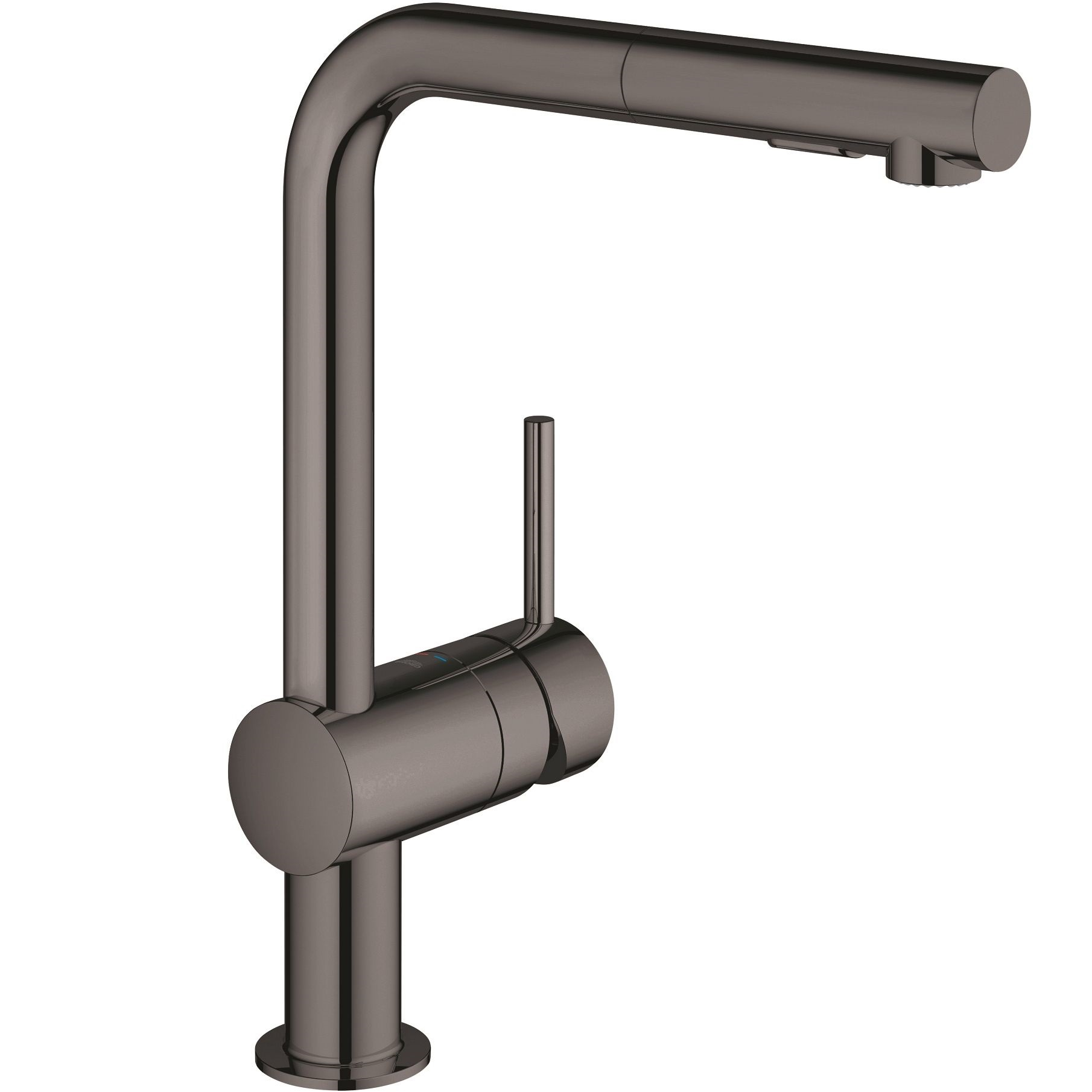 Стиль поєднується з продуктивністю у змішувачі для кухні Minta. Завдяки Л-подібному виливу цей змішувач стане привабливим акцентом на вашій кухні. Ретельно продуманий до дрібниць, він пропонує неперевершену універсальність. Він оснащений регульованим поворотним механізмом, який можна встановити на 360°, що дозволяє зафіксувати вилив у потрібному положенні або легко перемикатися між двома чашами. Завдяки високому виливу можна без зусиль наповнювати навіть високі каструлі. Висувний вилив можна використовувати у двох варіаціях: струмінь і душ. Керамічний картридж Grohe SilkMove забезпечує плавний і точний контроль води та температури протягом усього терміну служби. Змішувач буде виглядати бездоганно протягом багатьох років, оскільки він має міцне покриття Grohe StarLight для додаткового рівня стійкості до подряпин. Завдяки системі Easy Installation System ви зможете встановити новий кухонний змішувач за лічені секунди.