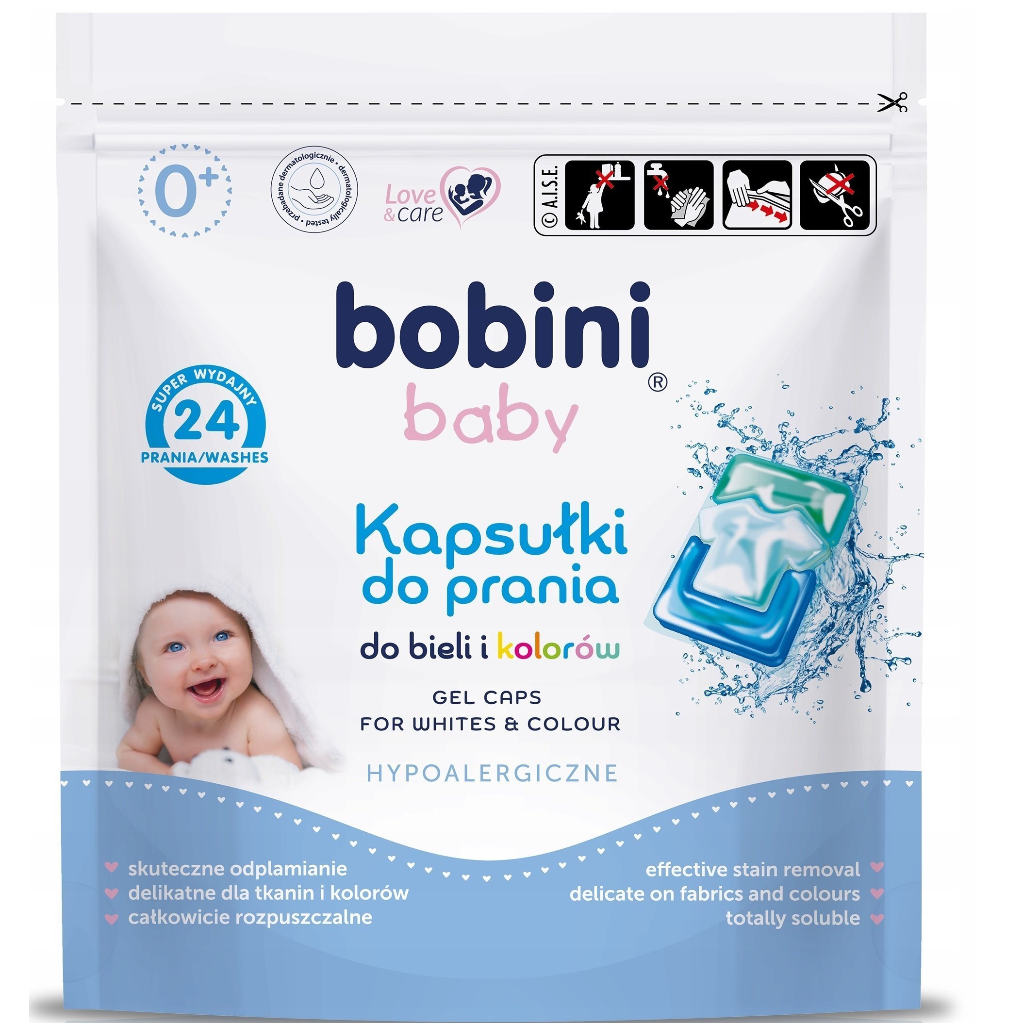Bobini Baby капсулы для стирки белых и цветных тканей были созданы для ухода за одеждой ребенка с первых дней его жизни. Одежда, выстиранная в капсулах, мягкая для нежной кожи новорожденных и маленьких детей. Они полностью растворимы и хорошо вымываются. Продукт дерматологически протестирован.