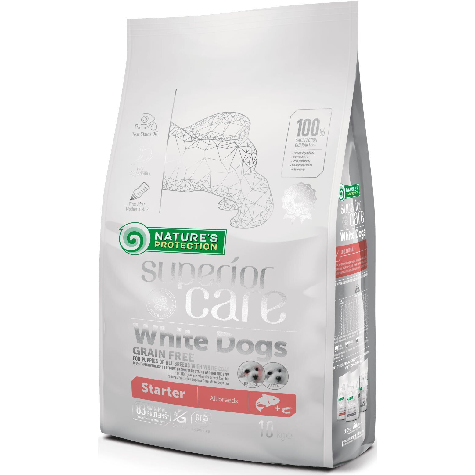 Сухой беззерновой корм Nature's Protection Superior Care с лососем для щенков (стартер) всех пород - это полноценный и сбалансированный корм Супер премиум сегмента с источником белка и сырья высочайшего качества, помогающий бороться с коричневыми пятнами от слез и поддерживать кожу и шерсть здоровыми. Корм содержит формулу Tear Stains off - тщательно подобранный комплекс аминокислот и хорошо сбалансированных ингредиентов в составе. Обогащен компонентами, обеспечивающими отличную производительность для хорошего самочувствия питомца. Полноценный состав сухого корма не только обеспечит вашего любимца всеми необходимыми питательными веществами, но и обладает отличными вкусовыми качествами и усвояемостью. Подходит кормящим самкам. Основной источник белка в этом полноценном сухом корме для щенков - лосось. Лосось как источник белка богат Омега кислотами, способствующими укреплению иммунной системы и поддержанию здорового развития. Также содержит антарктический криль, уникальный и экологический источник Омега-3 и хлонина для здорового развития, надлежащего развития мозга и здорового роста. Полноценный и сбалансированный состав этого сухого корма для щенков - обогащенный клиноптилолитом природного вулканического происхождения, MicroZeoGen. Он способствует выведению токсинов из организма питомца, и после детоксикации ценные питательные вещества, витамины и минералы легко абсорбируются организмом. Состав корма обогащен Омега-3 и Омега-6 жирными кислотами, необходимыми для здорового состояния кожи и шерсти. Хорошо сбалансированная питательность этого сухого корма обеспечивает и поддержку иммунной системы благодаря моно- и полинасыщенным жирным кислотам, и энергичность благодаря насыщенным жирным кислотам, необходимым для здорового развития щенков.