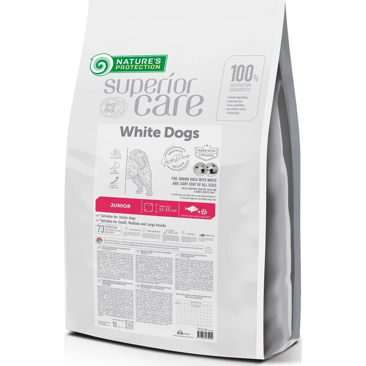 Сухой корм Nature's Protection Superior Care с белой рыбой для растущих собак всех размеров – это полноценный и сбалансированный корм супер премиум сегмента с источником белка и сырья высочайшего качества, который помогает бороться с коричневыми пятнами от слез и поддерживать кожу и шерсть здоровыми. Размер гранул – очень универсальный: 13-15 мм, что делает его пригодным для собак любого размера и возраста. Подходит для крупных пород, которые предпочитают мелкий корм, и для молодых собак, которые любят есть более крупный корм. Содержит формулу Tear Stains off – тщательно подобранный комплекс аминокислот и хорошо сбалансированных ингредиентов в составе. Корм содержит белый рис, который обеспечивает энергией, не отягощая пищеварительную систему и помогает поддерживать общую функцию кишечника. Полноценный состав сухого корма не только обеспечит вашего питомца всеми необходимыми питательными веществами, но и гарантирует идеальную усвояемость и вкусовые качества. Основной источник белка в этом полноценном сухом корме для растущих собак всех размеров – белая рыба. Это гипоаллергенный, легкоусвояемый, богатый питательными веществами белок, который обеспечивает незаменимыми аминокислотами, а также является хорошим источником цинка. Состав обогащен витаминами А и D, что является еще более полезными для иммунной системы собак. В его состав входят замечательные отличные Омега-3 и Омега-6 жирных кислот, которые помогают поддерживать интенсивный цвет шерсти и идеальное состояние кожи. Белая рыба также является источником нежирного белка, что делает ее хорошим вариантом для домашних любимцев, нуждающихся в диете с низким содержанием жира.