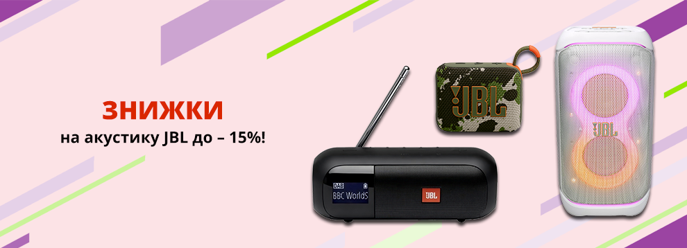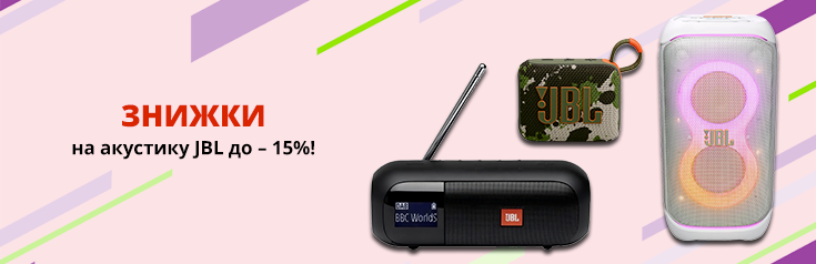 - На акустику JBL діють спеціальні ціни зі знижкою до - 15%. *Ціни вказані у гривнях. Кількість товару за акційними цінами обмежена. Ціни та умови пропозиції можуть бути змінені протягом дії акції. Зображення товару на фото може відрізнятись від фактичного.