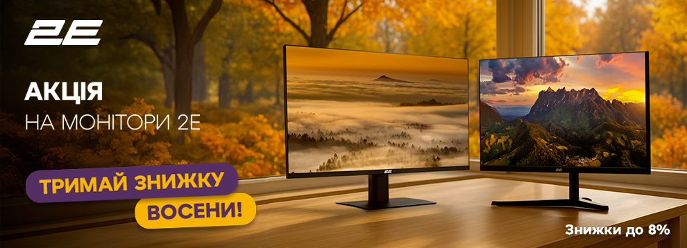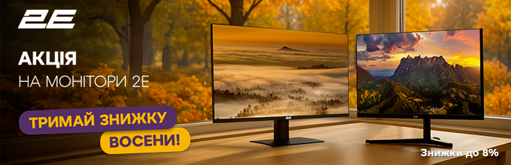 - Осінь з вигодою разом із 2E! Працюй, навчайся та грай комфортно — монітори 2E для будь-яких задач тепер доступні зі знижками. Якість зображення, сучасний дизайн та вигідна ціна чекають на тебе! *Акція діє при покупці готівкою або кредитною карткою. Ціни вказані у гривнях, кількість товару обмежена. Ціни та умови пропозиції можуть бути змінені протягом дії акції. Зображення товару на фото може відрізнятися від фактичного. Акційна пропозиція дійсна на території України за винятком тимчасово окупованих територій та територій населених пунктів, що розташовані в зоні бойових дій та на лінії зіткнення.