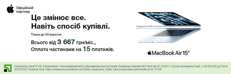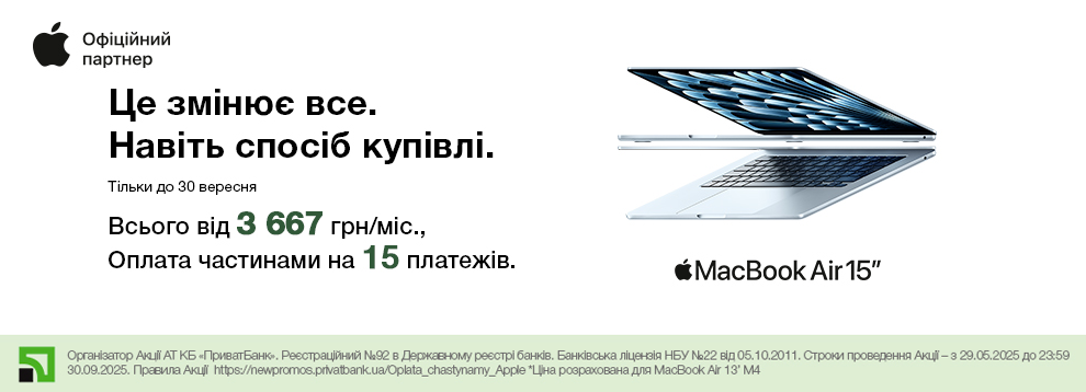 Організатор Акції АТ КБ «ПриватБанк». Реєстраційний №92 в Державному реєстрі банків. Банківська ліцензія НБУ №22 від 05.10.2011. Строки проведення Акції – з 29.05.2025 до 23:59 30.09.2025. Правила Акції. *Ціна розрахована для MacBook Air 13’ M4