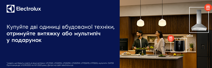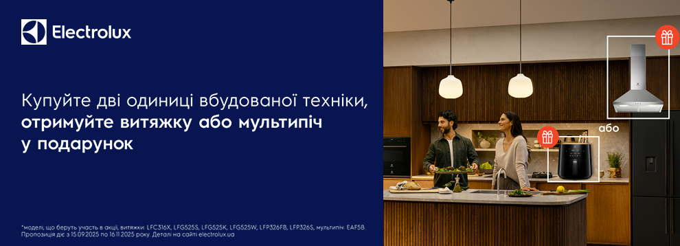 • *При купівлі двох одиниць продукції, яка бере участь в Акції, що здійснено в межах 1 (однієї) транзакції (одним чеком). Покупець може отримати подарунок Витяжка Electrolux LFG525S, або Витяжка Electrolux LFG525K, або Витяжка Electrolux LFG525W, або Витяжка Electrolux LFP326FB, на вибір. Акціє діє в кредит та не перетинається з іншими акціями. Ціни вказані в гривнях. Кількість акційного товару обмежена. Під подарунком мається на увазі можливість придбати подарунок за 1 грн. Повернення можливе тільки трьох товарів. Ціни і умови пропозиції можуть змінюватися впродовж дії акції. Зображення та характеристики товару можуть відрізнятися від картинки.