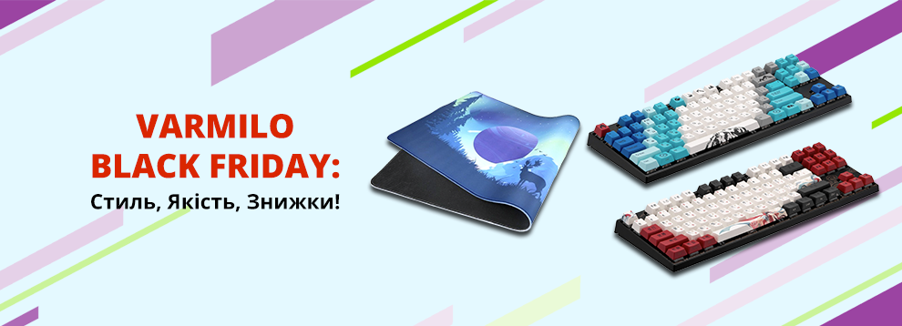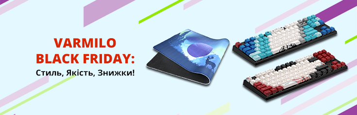 - Поринь у світ естетики та преміальної якості разом із Varmilo! У Чорну п’ятницю знижки діють на культові механічні клавіатури, дизайнерські кейкапи та XL-ігрові поверхні. Онови свій сетап стильними рішеннями, створеними для комфорту, точності та натхнення. *Акція діє при покупці готівкою або кредитною карткою. Ціни вказані у гривнях, кількість товару обмежена. Ціни та умови пропозиції можуть бути змінені протягом дії акції. Зображення товару на фото може відрізнятися від фактичного. Доступно в кредит, розстрочку чи оплату частинами. Акційна пропозиція дійсна на території України за винятком тимчасово окупованих територій та територій населених пунктів, що розташовані в зоні бойових дій та на лінії зіткнення.
