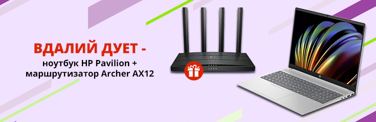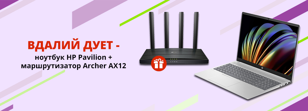 - Вдалий дует для роботи та розваг! Купуй ноутбук HP Pavilion та отримуй у подарунок маршрутизатор TP-Link Archer AX12. Насолоджуйся максимальною продуктивністю та швидким, стабільним інтернетом відразу після покупки. *Акція діє при покупці готівкою або кредитною карткою. Ціни вказані у гривнях, кількість товару обмежена. Ціни та умови пропозиції можуть бути змінені протягом дії акції. Зображення товару на фото може відрізнятися від фактичного. Доступно в кредит, розстрочку чи оплату частинами. Акція підсумовується з іншими пропозиціями. Повернення можливе лише комплектом (основний товар + подарунок). Під подарунком мається на увазі можливість придбати подарунки (Подарунок_Маршрутизатор TP-LINK ARCHER AX12 (ARCHER-AX12_gift)) за 1 грн.