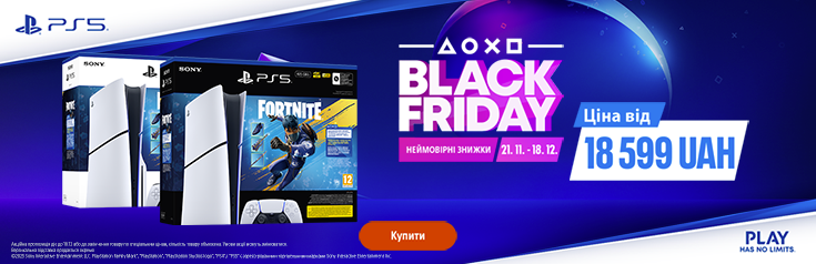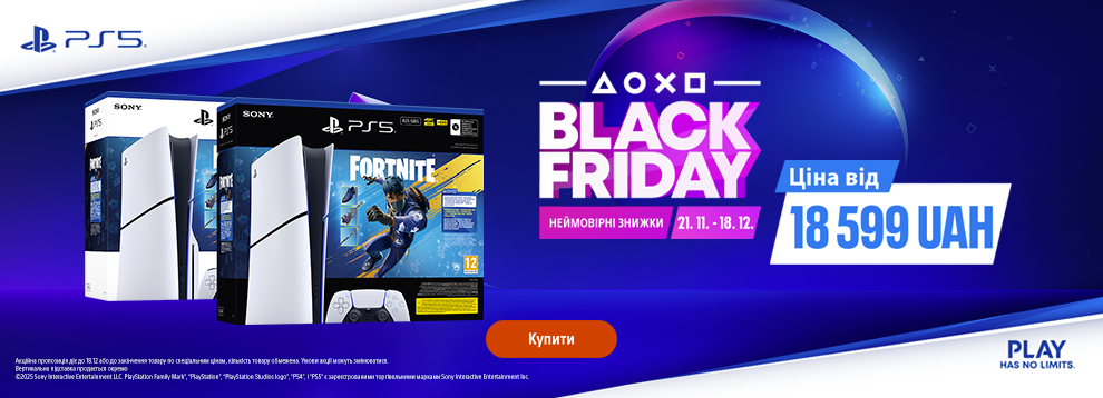 - Ти чекав цього цілий рік. Цього Black Friday ми робимо неможливе:PlayStation 5 Slim — від 18 599 грн! Ціни падають. Твій шанс — зараз. Не відпускай свою PS5! *Акція діє при покупці готівкою або кредитною карткою. Ціни вказані у гривнях, кількість товару обмежена. Ціни та умови пропозиції можуть бути змінені протягом дії акції. Зображення товару на фото може відрізнятися від фактичного. Доступно в кредит, розстрочку чи оплату частинами. Акція підсумовується з іншими пропозиціями. Акційна пропозиція дійсна на території України, за винятком тимчасово окупованих територій та територій населених пунктів, що розташовані в зоні бойових дій та на лінії зіткнення.