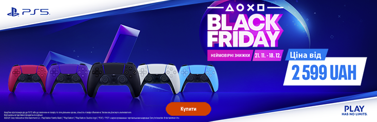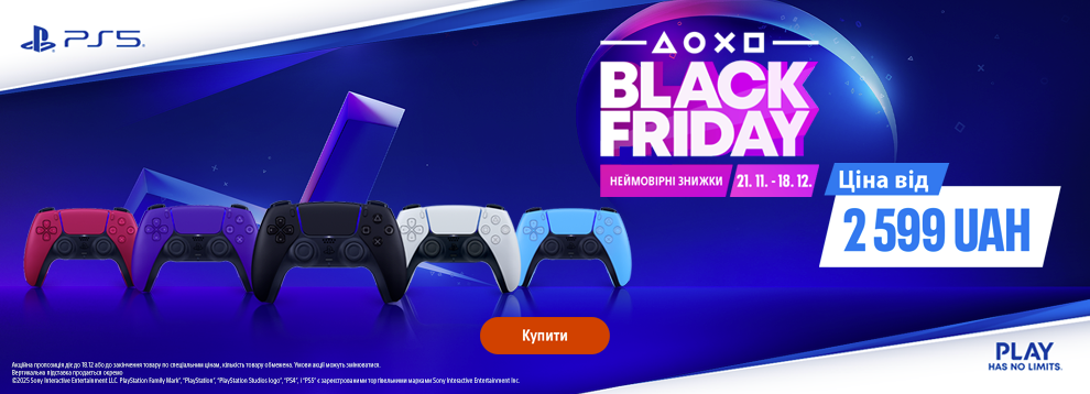 • BLACK FRIDAY – шалені знижки на DualSense для PS5! Тільки зараз: усі кольори та моделі за найнижчими цінами 2025 року! *Акція діє при покупці готівкою або кредитною карткою. Ціни вказані у гривнях, кількість товару обмежена. Ціни та умови пропозиції можуть бути змінені протягом дії акції. Зображення товару на фото може відрізнятися від фактичного. Доступно в кредит, розстрочку чи оплату частинами. Акція підсумовується з іншими пропозиціями. Акційна пропозиція дійсна на території України, за винятком тимчасово окупованих територій та територій населених пунктів, що розташовані в зоні бойових дій та на лінії зіткнення.