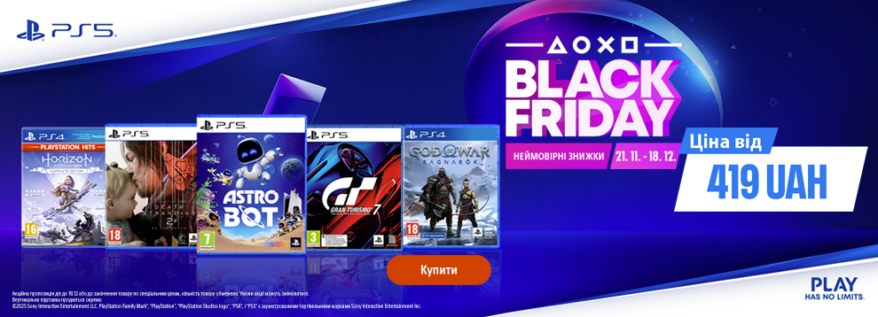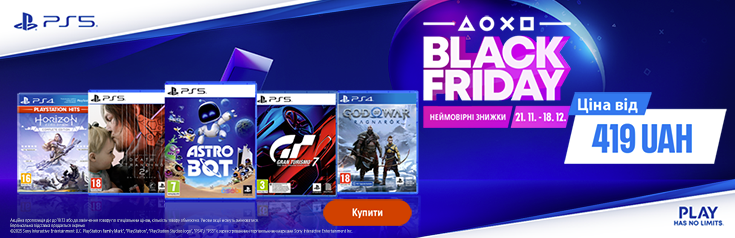 - BLACK FRIDAY – наймасштабніший розпродаж ігор PlayStation! Новинки, ексклюзиви, хіти всіх часів - тільки зараз ціни такі низькі. *Акція діє при покупці готівкою або кредитною карткою. Ціни вказані у гривнях, кількість товару обмежена. Ціни та умови пропозиції можуть бути змінені протягом дії акції. Зображення товару на фото може відрізнятися від фактичного. Доступно в кредит, розстрочку чи оплату частинами. Акція підсумовується з іншими пропозиціями. Акційна пропозиція дійсна на території України, за винятком тимчасово окупованих територій та територій населених пунктів, що розташовані в зоні бойових дій та на лінії зіткнення.