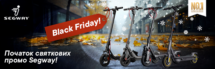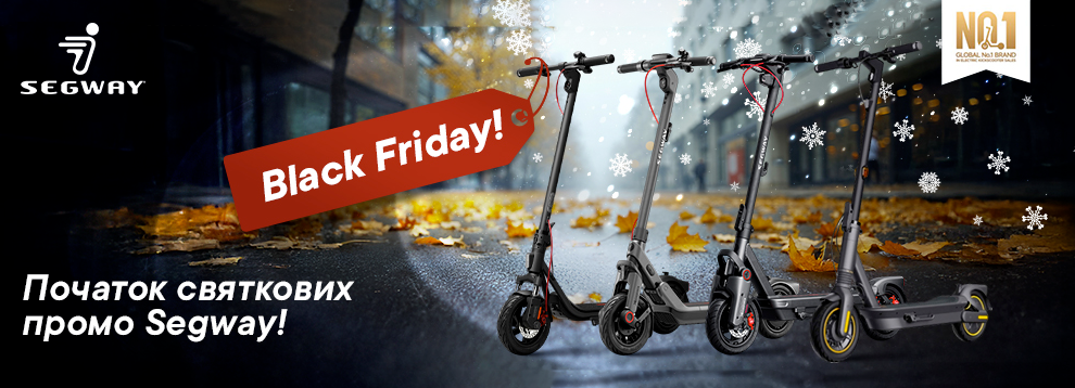 - Встигни на Segway Black Friday! Обирай свій електросамокат Segway-Ninebot або стильні аксесуари за неймовірними цінами. Підкорюй місто швидко, безпечно та з вигодою — з Segway кожна поїздка стає задоволенням! *Акція діє при покупці готівкою або кредитною карткою. Ціни вказані у гривнях, кількість товару обмежена. Ціни та умови пропозиції можуть бути змінені протягом дії акції. Зображення товару на фото може відрізнятися від фактичного. Доступно в кредит, розстрочку чи оплату частинами. Акція підсумовується з іншими пропозиціями. Акційна пропозиція дійсна на території України, за винятком тимчасово окупованих територій та територій населених пунктів, що розташовані в зоні бойових дій та на лінії зіткнення.