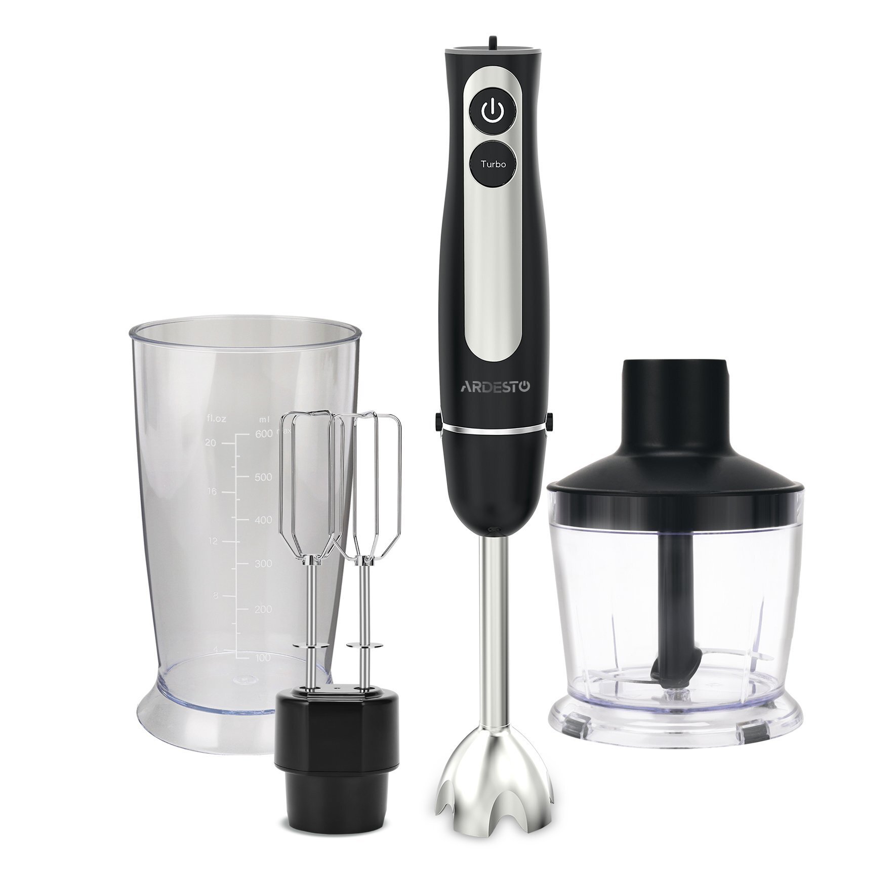 Універсальні аксесуари: стакан на 600 мл, насадка-міксер з двома вінчиками, подрібнювач на 500 мл.
