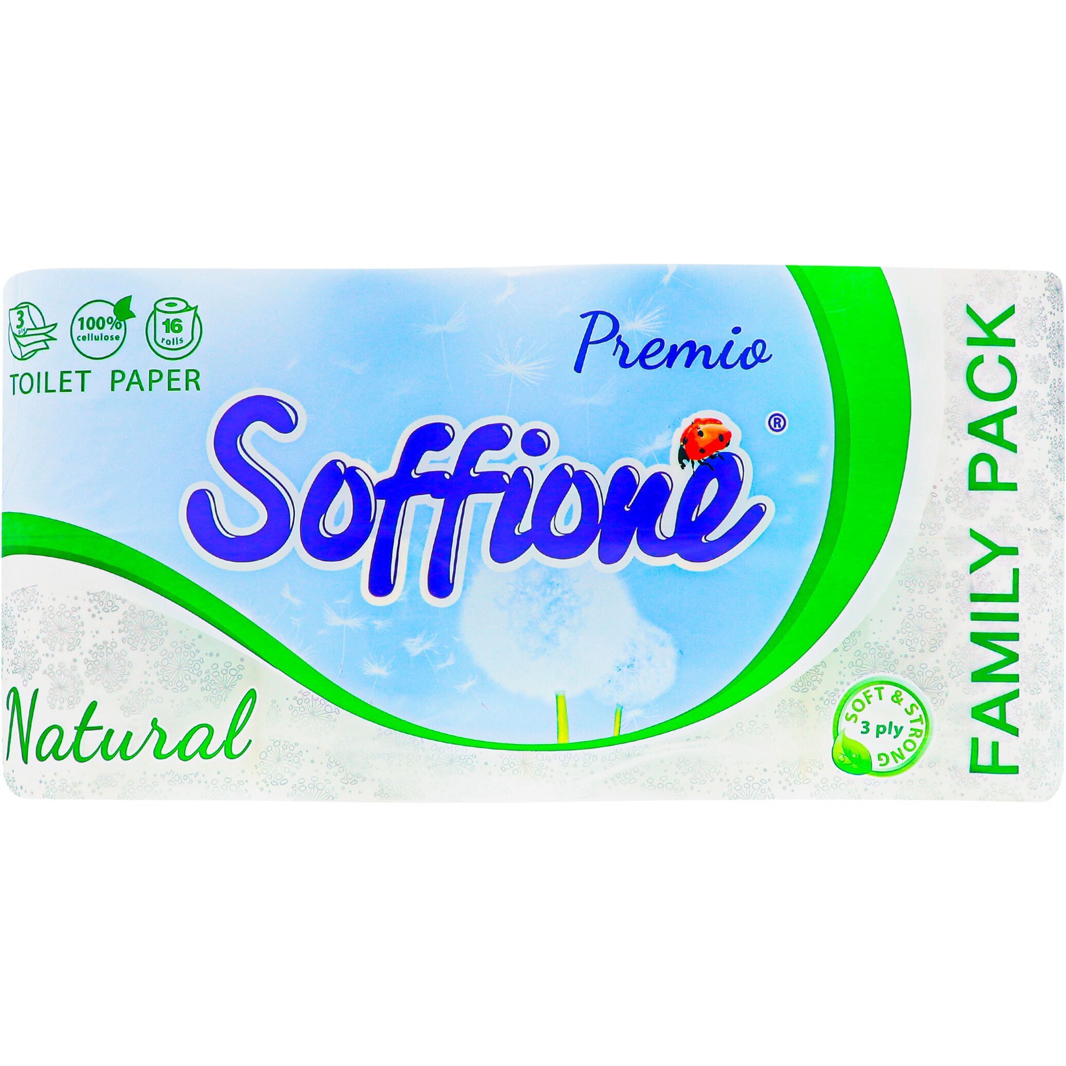 Soffione — це паперові вироби, виготовлені зі 100% первинної целюлози, які надають безпечний комфорт сім'ї й допомагають створювати затишок у домі. Продукція європейського рівня за українською ціною. Якість та безпека продукції Soffione підтверджені європейським сертифікатом ISEGA. Soffione — найкраще від природи для вас і вашого комфорту! Тришаровий туалетний папір Soffione Premio Natural — 100% натуральний, білий, без барвників і ароматизаторів. Відривні аркуші мають зручний формат, а велика упаковка дає змогу істотно заощадити.