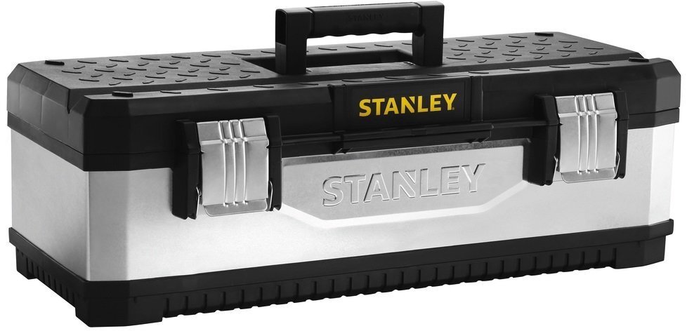 Ящик для инструмента профессиональный ”Stanley” металлопластмассовый гальванизированный. Одна длинная металлическая петля для усиления конструкции и возможности переноски большого веса Большие прочные металлические с защитой от коррозии замки Эргономичная ручка из двух материалов Вместительный металлический корпус 3-х наиболее востребованных размеров V-образный паз в крышке ящика для удобства расположения детали при пилении Переносной лоток для транспортировки инструмента и мелких деталей Отверстия в замках для возможности использования навесного замка для максимальной защиты инструмента