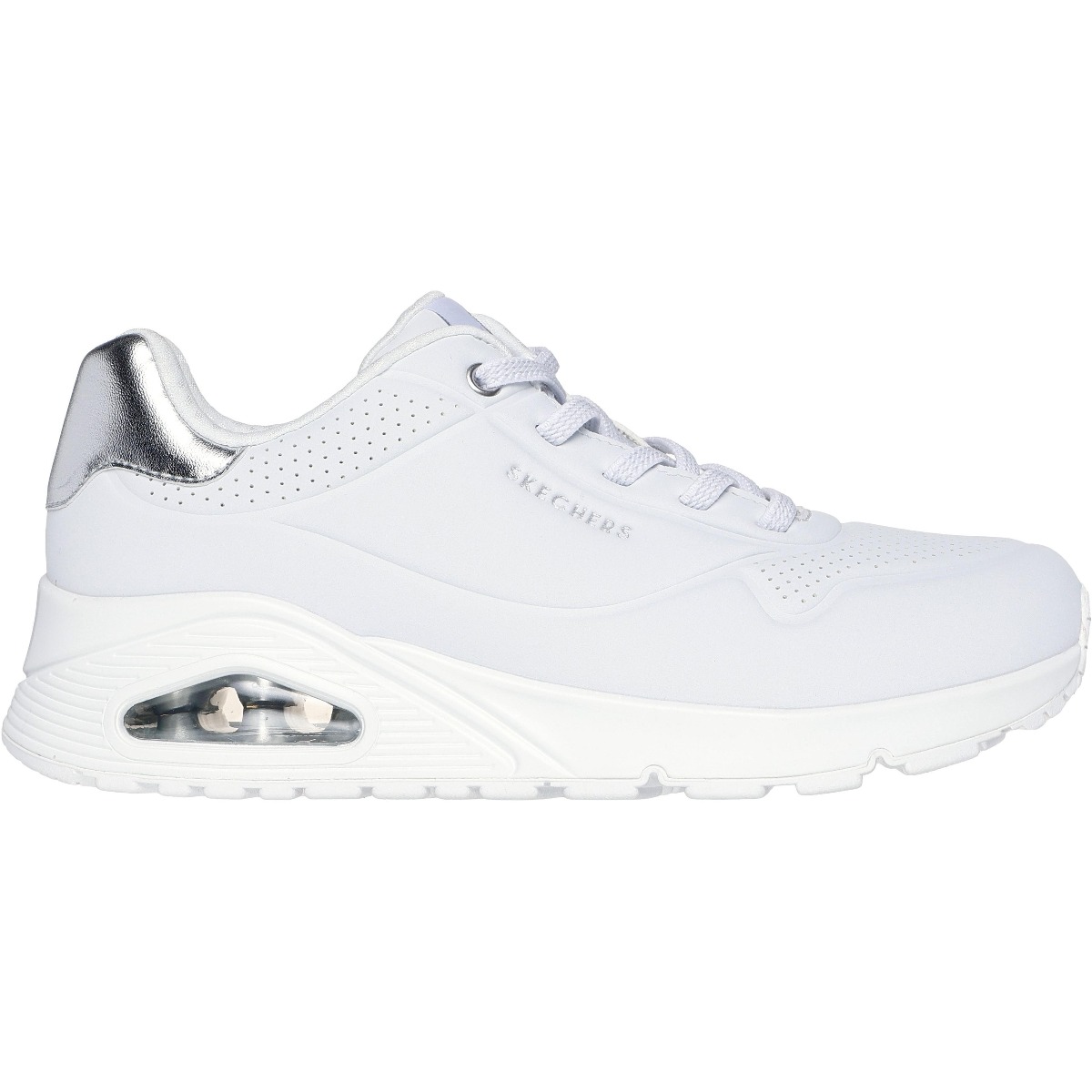 Насолоджуйтесь класичним стилем в цьому сезоні в кросівках Skechers Uno - Shimmer Away в білому кольорі з оздобленням зі срібла. Ці модні кросівки мають верх із дюрабуку з металевою обробкою, стрейчеві шнурки, устілку Skechers Memory Foam з повітряним охолодженням та видиму підошву з повітряною подушкою Skech-Air.