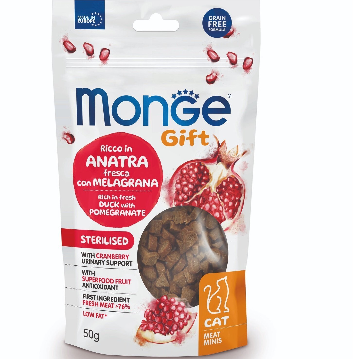 Monge gift sterilized cat rich in fresh duck with pomegranate and cranberry - це додатковий корм для стерилізованих дорослих кішок. Спеціально розроблений для хорошого самопочуття Вашої кішки завдяки журавлині для підтримки сечовивідних шляхів і завдяки низькому вмісту жиру для підтримки ідеальної маси тіла. Продукт, виготовлений без злаків, зі свіжим м'ясом, цінним джерелом легкозасвоюваних білків з високою біологічною цінністю.